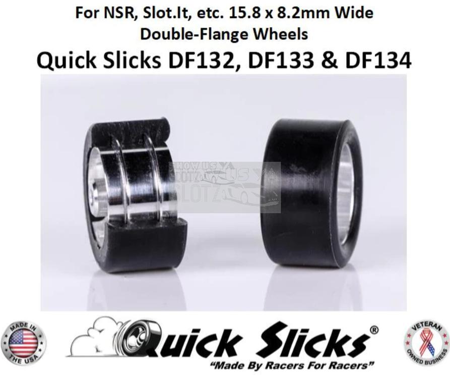 Gli pneumatici Quick Slicks DF134XF sono progettati per le ruote NSR, Sideways e Slot.It selezionate a doppia flangia da 15 mm, 16 mm e 17 mm elencate di seguito che in genere utilizzano pneumatici con un piccolo traferro tra le flange delle ruote. Questi pneumatici presentano un design esclusivo che riempie completamente lo spazio tra le flange.